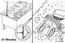 Plug the overhead oil rifle push tube cavities and coolant passages in the cylinder block, and use a rotary wire brush to remove the carbon ring from the top of the cylinder liner. Use a scraper that has an aluminum blade, if a rotary wire brush is not available.