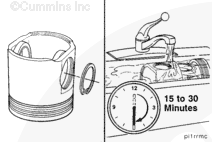 Lubricate the piston and the ring assembly by hand with clean 15W-40 lubricating oil. Dipping is okay, but draining is very difficult because the piston does not have drain holes. If dipping, only dip up to the pin bore, then hand lubricate it and the remaining skirt.