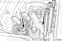 Hold the push rod with one hand to prevent it from falling into the engine. Loosen each adjusting screw and remove the push rod.